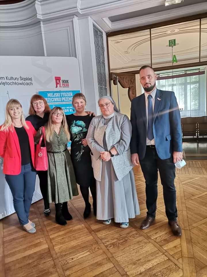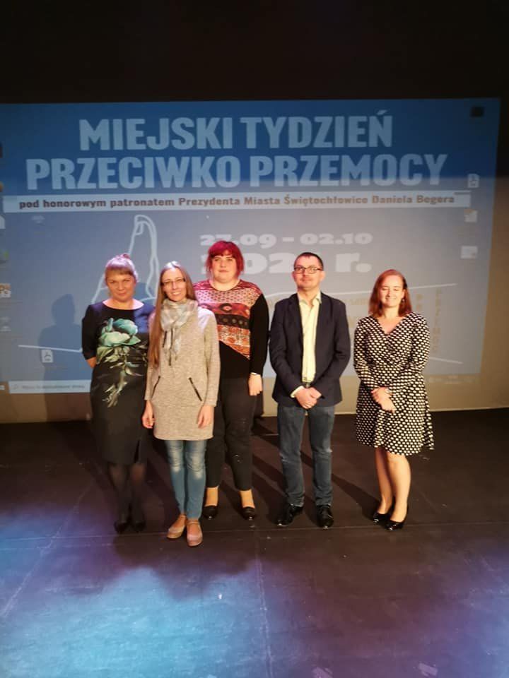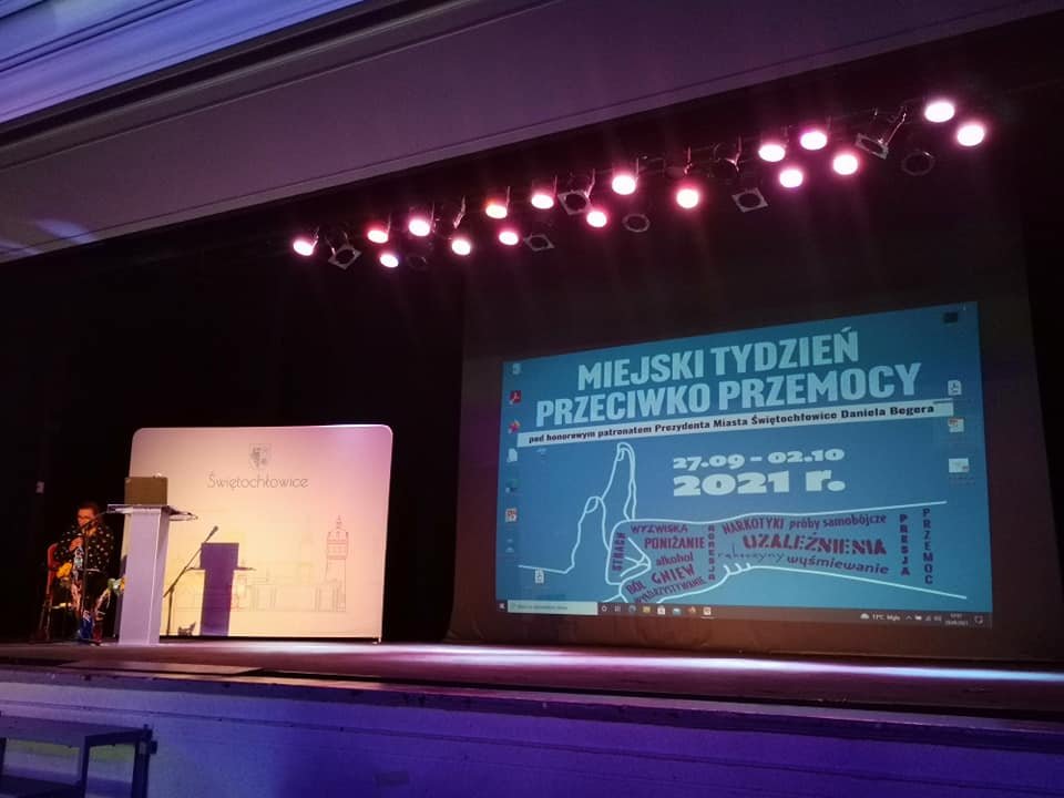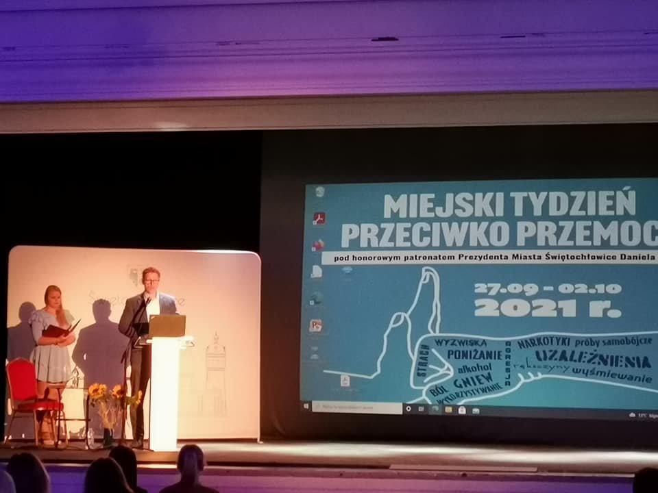 W ramach Miejskiego Tygodnia Przeciwko Przemocy w dniu 29.09.2021 r. odbyła się, w Centrum Kultury Śląskiej, ogólnodostępna konferencja pod nazwą: „Bez przemocy, bez używek”, której wraz z Wydziałem Rozwoju i Polityki Społecznej Urzędu Miejskiego w Świętochłowicach oraz Poradni Psychologiczno - Pedagogicznej w Świętochłowicach, byliśmy współorganizatorem. W konferencji udział wzięli Pan Daniel Beger - Prezydent Świętochłowic oraz Pan Adam Trzebinczyk - Drugi Zastępca Prezydenta Miasta Świętochłowice.